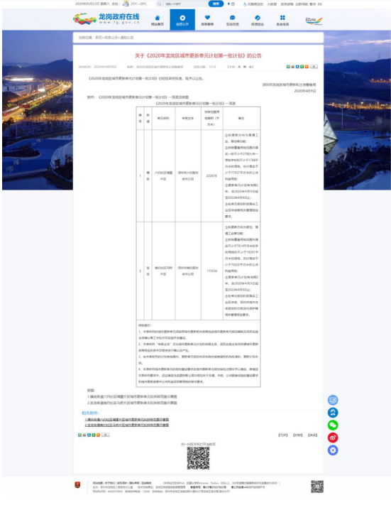 馬橋項目更新意愿、立項已在深圳市龍崗區(qū)政府網(wǎng)站上公示,根據(jù)公示的“更新單元計劃”。