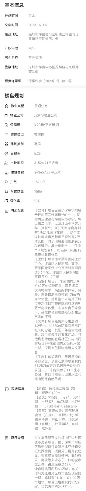 • 東關集團所開發的坪山江邊片區城市更新項目,位于深圳市坪山區馬巒街道江嶺路與比亞迪路交匯處西北側,項目分三期開發建設,擬建成集商品住房、商務辦公、商業等多業態于一體的城市綜合體,占地面積約12萬㎡,計容建筑面積約53萬㎡。東關珺府為江邊片區城市更新項目的一期,規劃有01-01、01-02兩個地塊,項目占地面積約3.2萬㎡,建筑面積約24.3萬㎡。